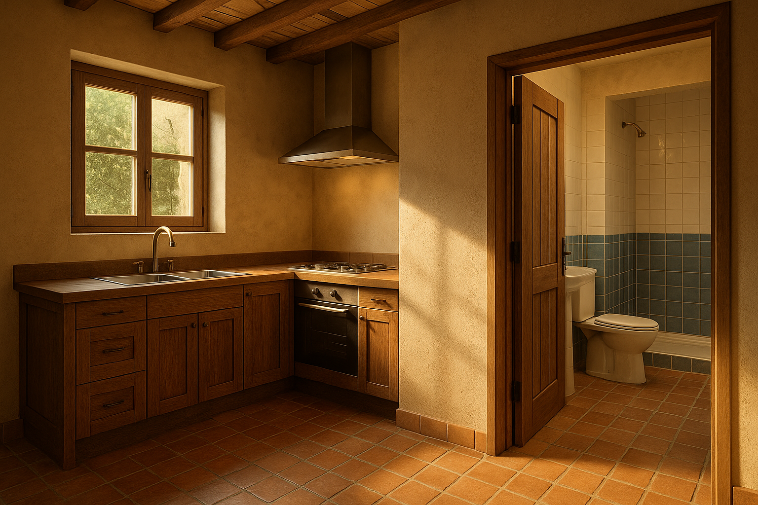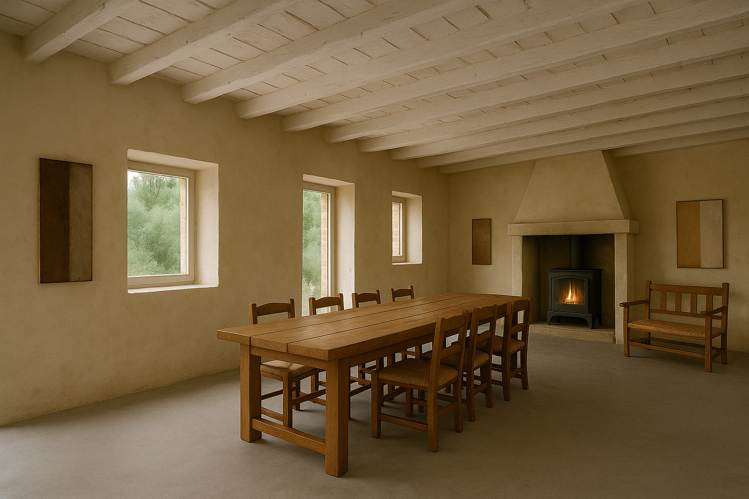 En el interior, las actuaciones incluyen la restauración de la chimenea, la habilitación del área de cocina y de los baños, y el acondicionamiento de un salón polivalente destinado a actividades culturales, formativas y comunitarias. Asimismo, se plantea la adecuación de la planta superior como espacio de almacenaje y para posibles pernoctaciones, ampliando así la funcionalidad del conjunto.